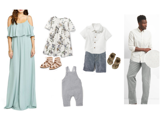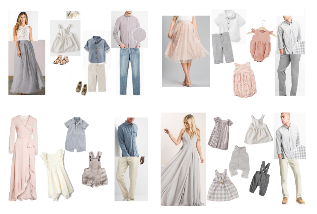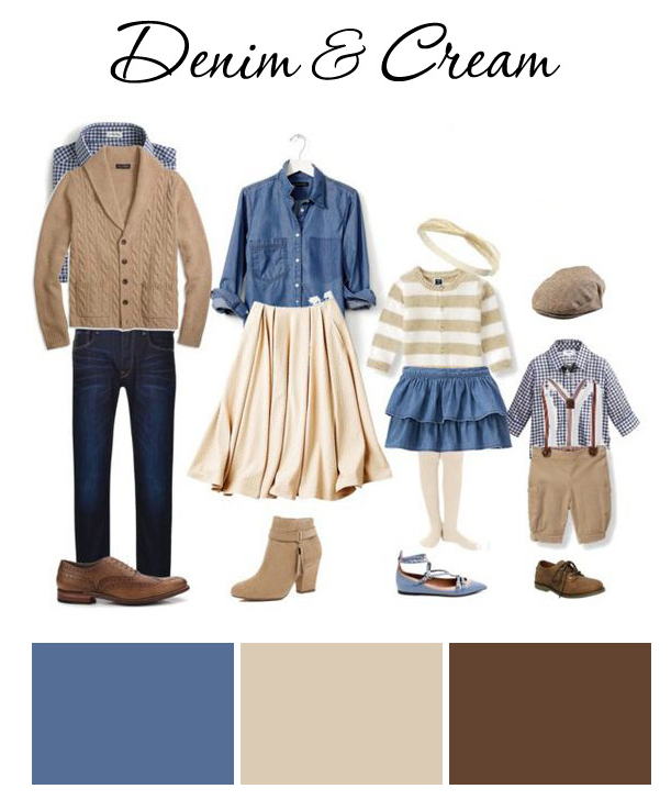This is a dressier spin on the previous neutral option. Obviously, we’ve got mom and daughter in skirts. Dad and son are wearing matched checkered shirts. And having mom’s denim on top and daughter’s denim on bottom creates a beautiful way for the viewers eye to move around your images.